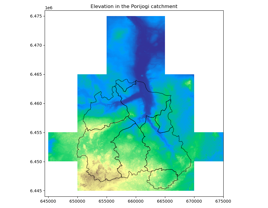 Out[73]: Text(0.5, 1.0, 'Elevation in the Porijogi catchment')