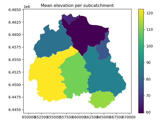 Out[85]: <AxesSubplot:title={'center':'Mean elevation per subcatchment'}>