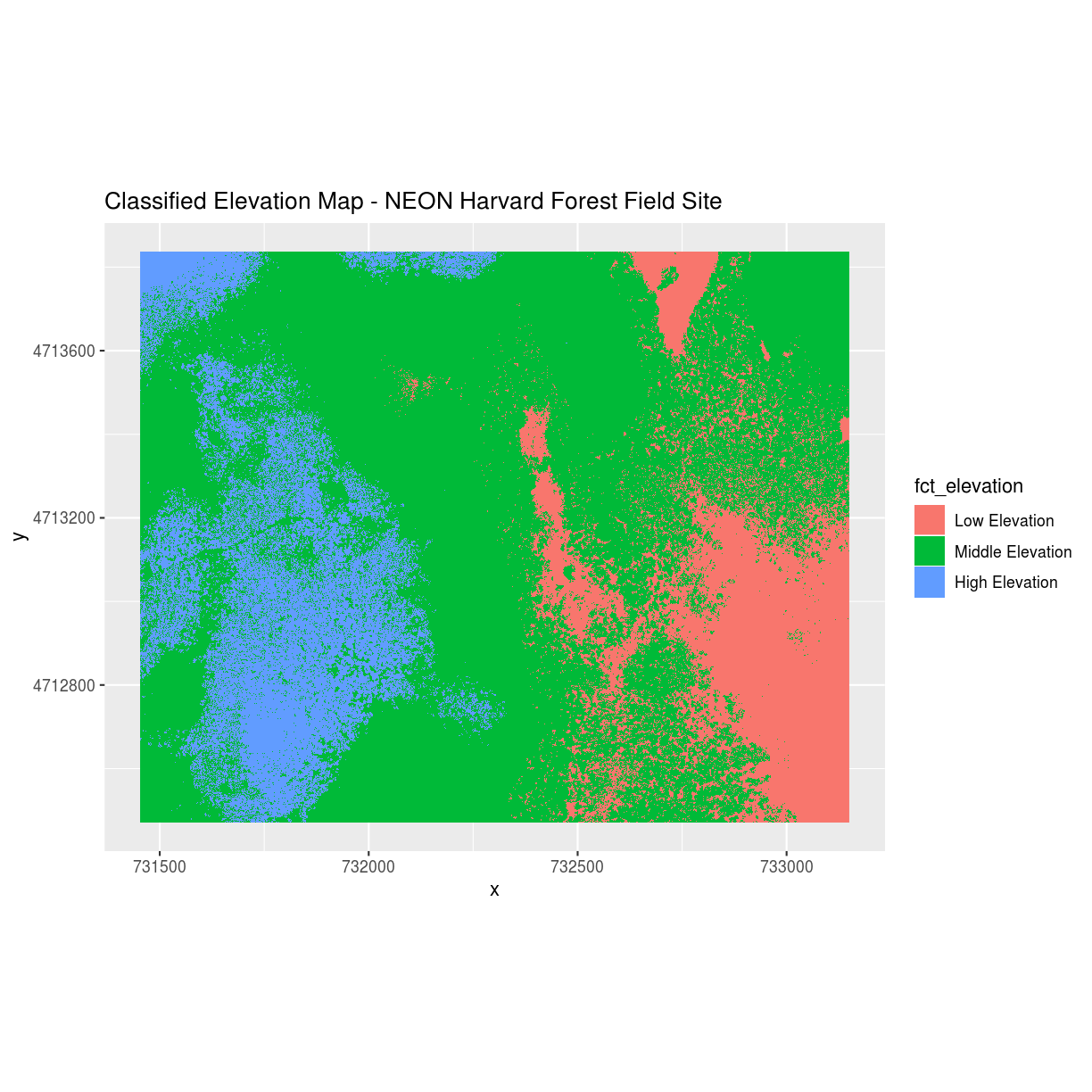 The following map shows elevation data for the NEON Harvard Forest field site. In this map, the elevation data (a continuous variable) has been divided up into categories to yield a categorical raster.