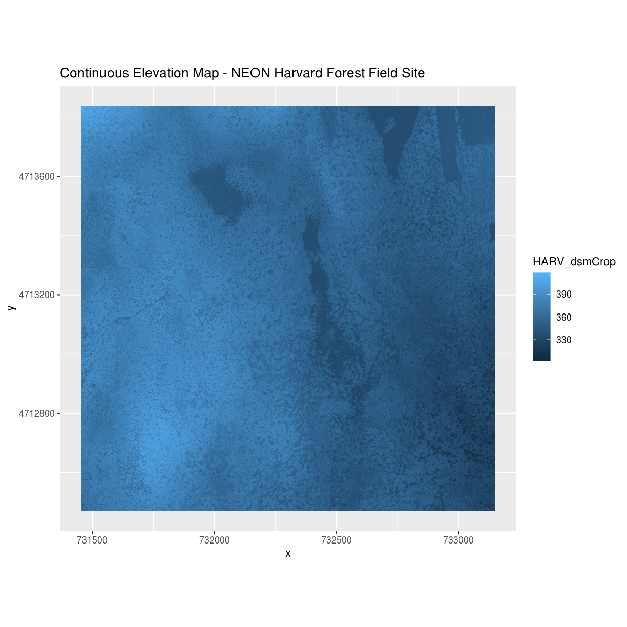 A map of elevation for Harvard Forest derived from the NEON AOP LiDAR sensor is below. Elevation is represented as continuous numeric variable in this map. The legend shows the continuous range of values in the data from around 300 to 420 meters.