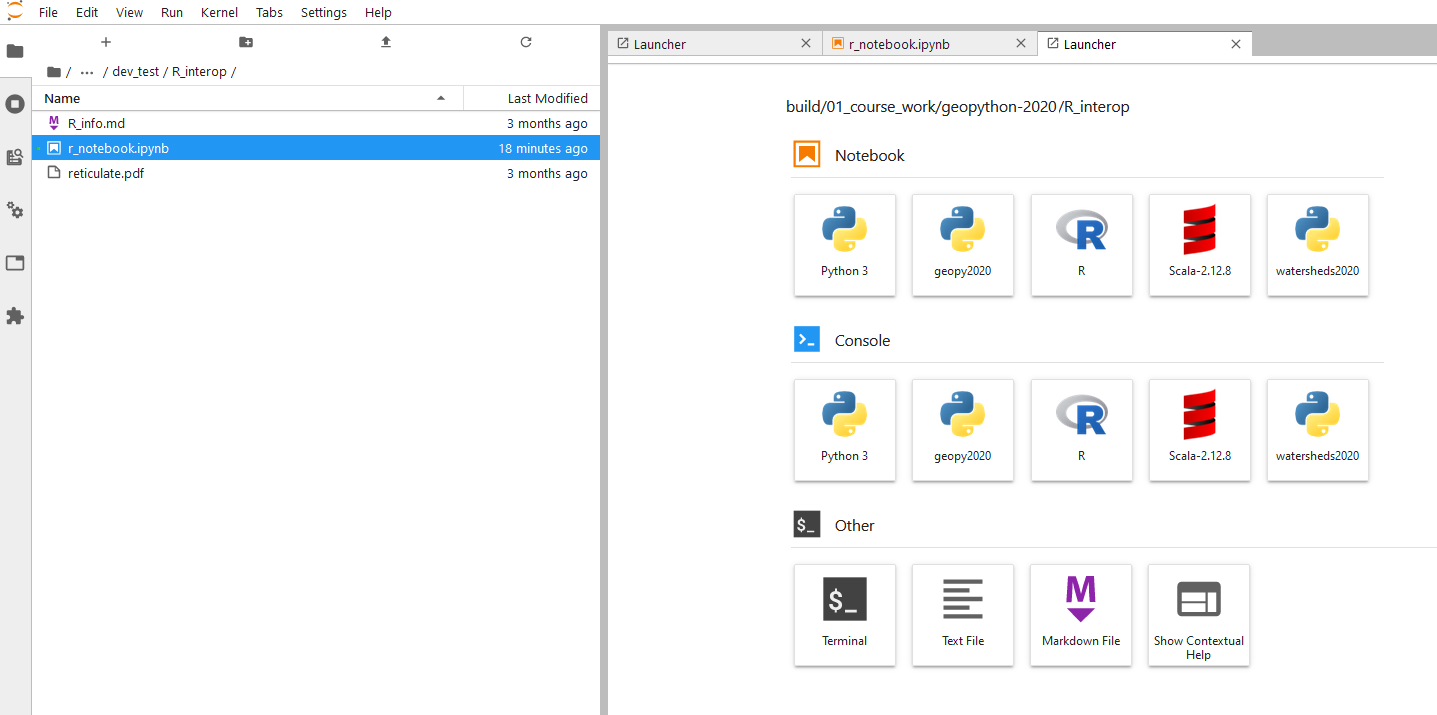 In R or R Studio you can simply install the R kernel package. As we have already Jupyter and everything set up in our geopy2020 environment, no additional Python-based configuration or installation is necessary.