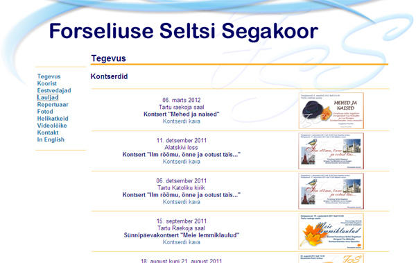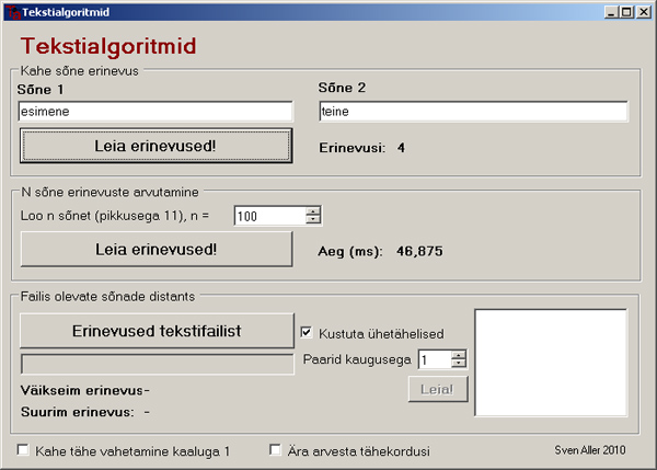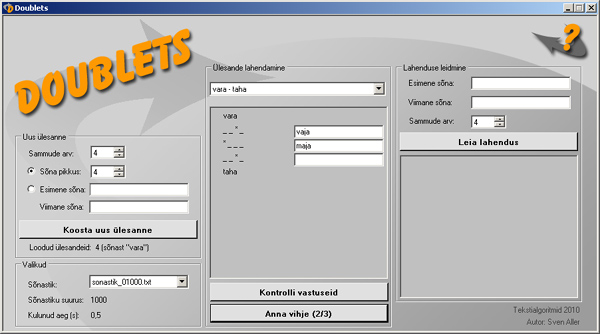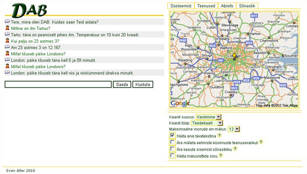 Emakeeleõppija korpusEestikeelsete tekstide (lõpukirjandid, uurimistööd jne) analüsaator. Kinnine keskkond Dialoogide pragmaatiline analüüsDialoogiaktide tuvastaja DAREC, dialoogistrateegiate määraja DIASTRAT ja Global WordNeti ConferenceAvalik ja suletud keskkond Tartu Ülikooli arvutimuuseumKasutajaliides, disain SILVERAvalik ja suletud keskkond Forseliuse Seltsi Segakoor (kuni 2014)Tartu Meeskoor Gaudeamus (kuni 2008)http://gaudeamus.awardspace.com/ Dialoogsüsteem DABLoomulikus eesti keeles suhtlus avalike veebiteenustega (bakalaureusetöö osa) LabürintHeksagonid, erinevad lahendusalgoritmid, C#, exe-fail Andmete visualiseerimine bioinformaatikasGeeniandmete võrdlemine, erinevad algoritmid (n-grammid, Smith-Waterman jne), PHP Klasterdamisalgoritmid Disain, kasutajaliides, andmete sisestus Sõnamäng DoubletsExe-fail, vajalik sõnastiku olemasolu samas kataloogis (1000 sõna, 200000 sõna), C# Sõnede erinevusedExe-fail, C# Televiisori kasutajaliidesKasutajaliideste kavandamine, erinevad distantspuldid, exe-fail, C# Muusikateooria-alane programm MuTeAkordide ja intervallide eristamine kuulmise järgi, Java, exe-fail (lahtipakitav) 8-mängTehisintellekt, brute force, C#, exe-fail KalahTehisintellekt, C#, exe-fail RändkaupmeesTehisintellekt, erinevad algoritmid (pimeotsing, lähim naaber, 2- ja 3-Opt), Misjonärid ja inimsööjadTehisintellekt, C#, exe-fail Esileht > Portfoolio