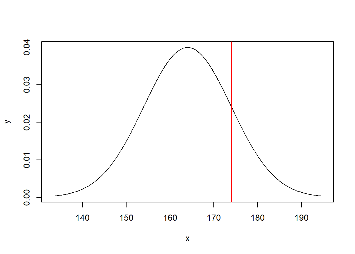 Seepärast ei uurita pidevate arvuliste tunnuste puhul mitte punktide tõenäosuseid, vaid mingite arvuvahemike (intervallide) tõenäosuseid. Ehk siis sõnastatakse küsimus ümber: kui suur on tõenäosus, et inimene on vähemalt 174 cm pikk: \[P(X\leqslant174)=?\] Ehk siis: kui tõenäoline on, et pikkus on 174,000… cm, 173.999… cm (muide, 174,000… on tegelikult täpselt sama arv, mis 173,999…), või et pikkus on 173,999…9899… cm või 173,999…98999…8999… cm jne. Kõik need arvud paiknevad üksteisega lõpmatult tihedalt koos: iga kahe arvu vahel leidub alati veel üks arv.